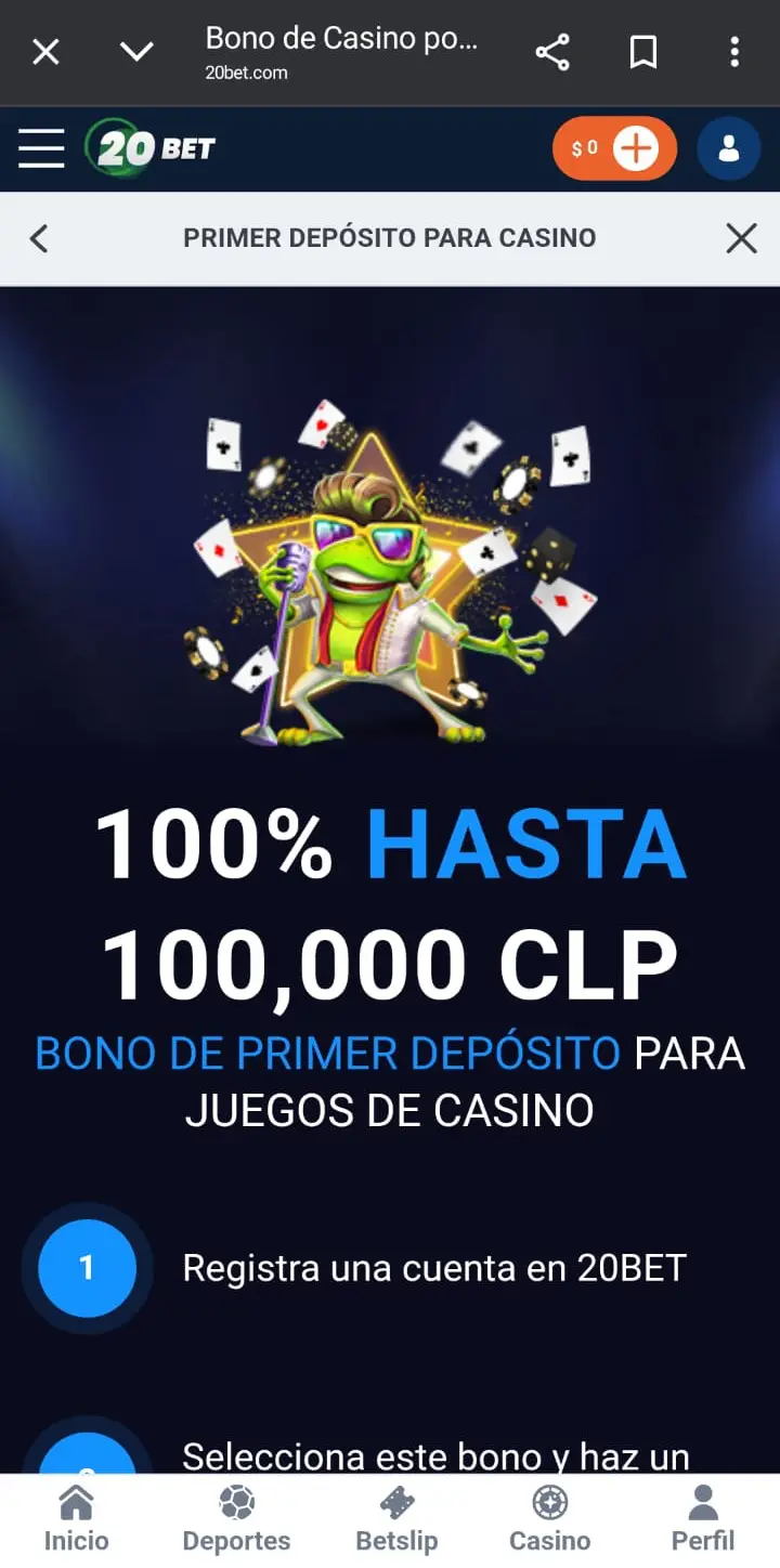 Con más de 6.500 juegos de casino y más de 30 deportes para apostar, 20Bet CL recibe a sus nuevos usuarios con un bono de bienvenida del 100% por hasta $100.000 + 120 giros gratis para juegos de casino o un bono para apuestas deportivas del 100% hasta $90.000 al registrarse tanto en el sitio web como descargando la 20bet app. Ahora conozcamos los mejores bonos que hay disponibles 20Bet Casino.