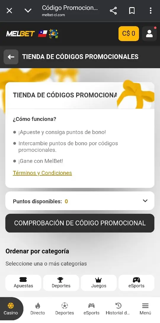 Los códigos promocionales Melbet se obtienen exclusivamente a través de la Tienda de Códigos Promocionales, canjeando los puntos de bono acumulados en la cuenta del jugador.